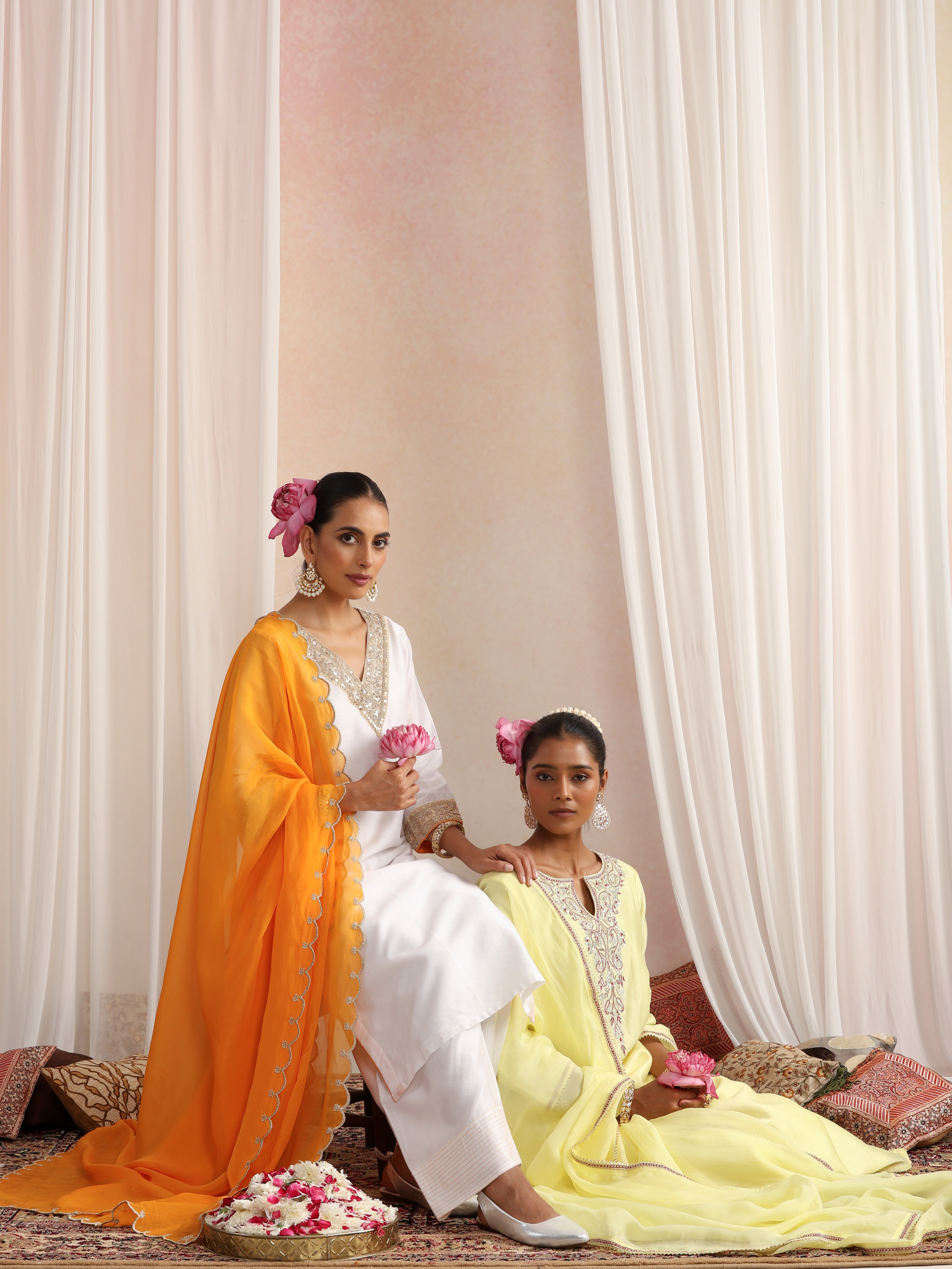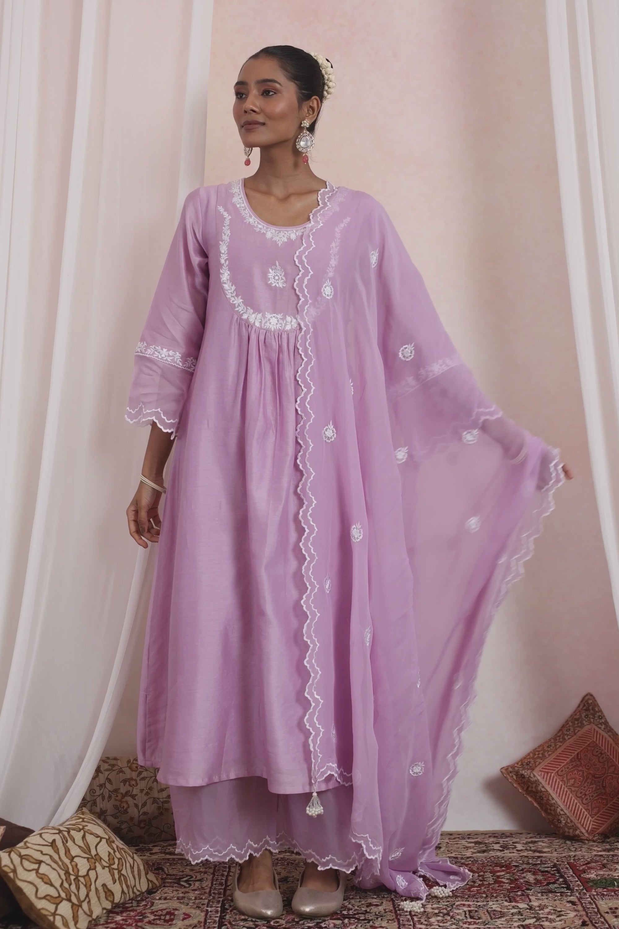 Step into a world of soft romance with the Devika Lavender Kurta Set. Crafted in luxurious pure Chanderi, this ensemble radiates feminine grace in a delicate lavender hue. The kurta is adorned with dainty white embroidery that whispers elegance, while the organza dupatta, detailed with scalloped edges and scattered motifs, adds an ethereal touch. Its flowy silhouette ensures both comfort and charm, making it perfect for festive mornings, serene evenings, or intimate celebrations. Light as air yet regal in appeal, Devika is more than attire—it’s a mood of effortless beauty and timeless sophistication.