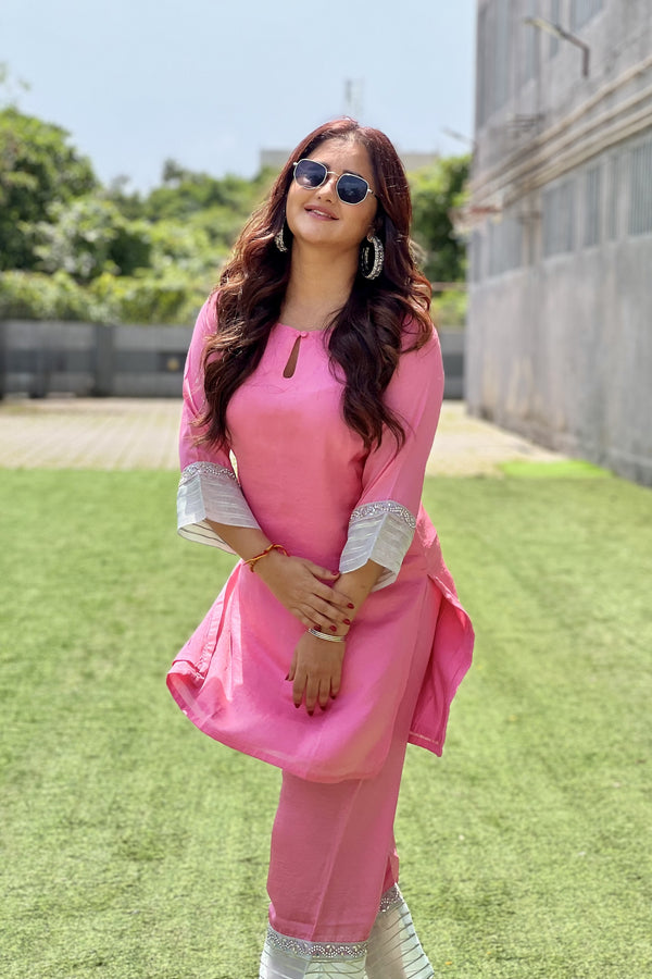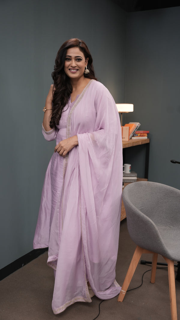 Step into a world of soft romance with the Devika Lavender Kurta Set. Crafted in luxurious pure Chanderi, this ensemble radiates feminine grace in a delicate lavender hue. The kurta is adorned with dainty white embroidery that whispers elegance, while the organza dupatta, detailed with scalloped edges and scattered motifs, adds an ethereal touch. Its flowy silhouette ensures both comfort and charm, making it perfect for festive mornings, serene evenings, or intimate celebrations. Light as air yet regal in appeal, Devika is more than attire—it’s a mood of effortless beauty and timeless sophistication.