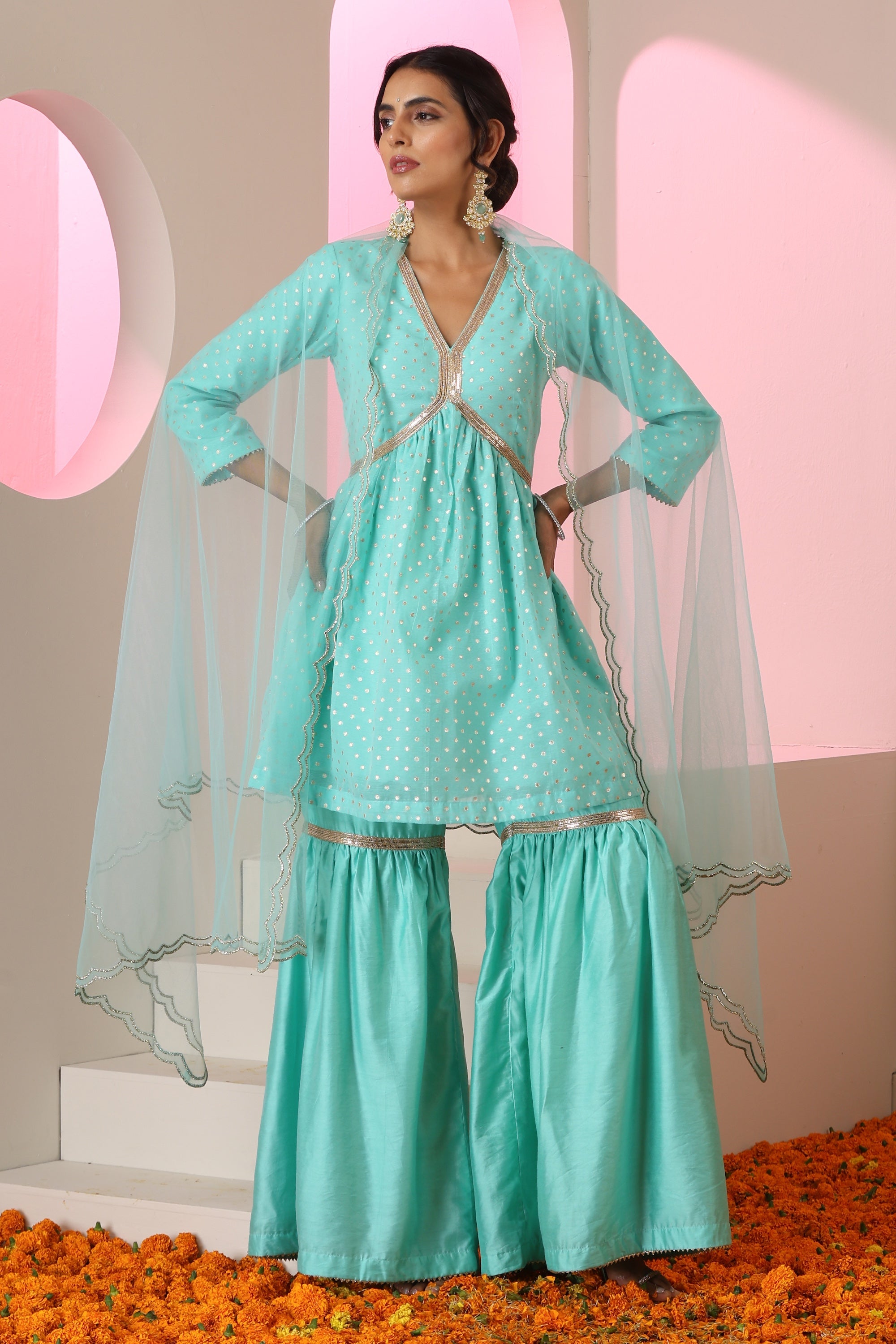 Contents: This ensemble includes a Kurta, a Palazzo & a Dupatta