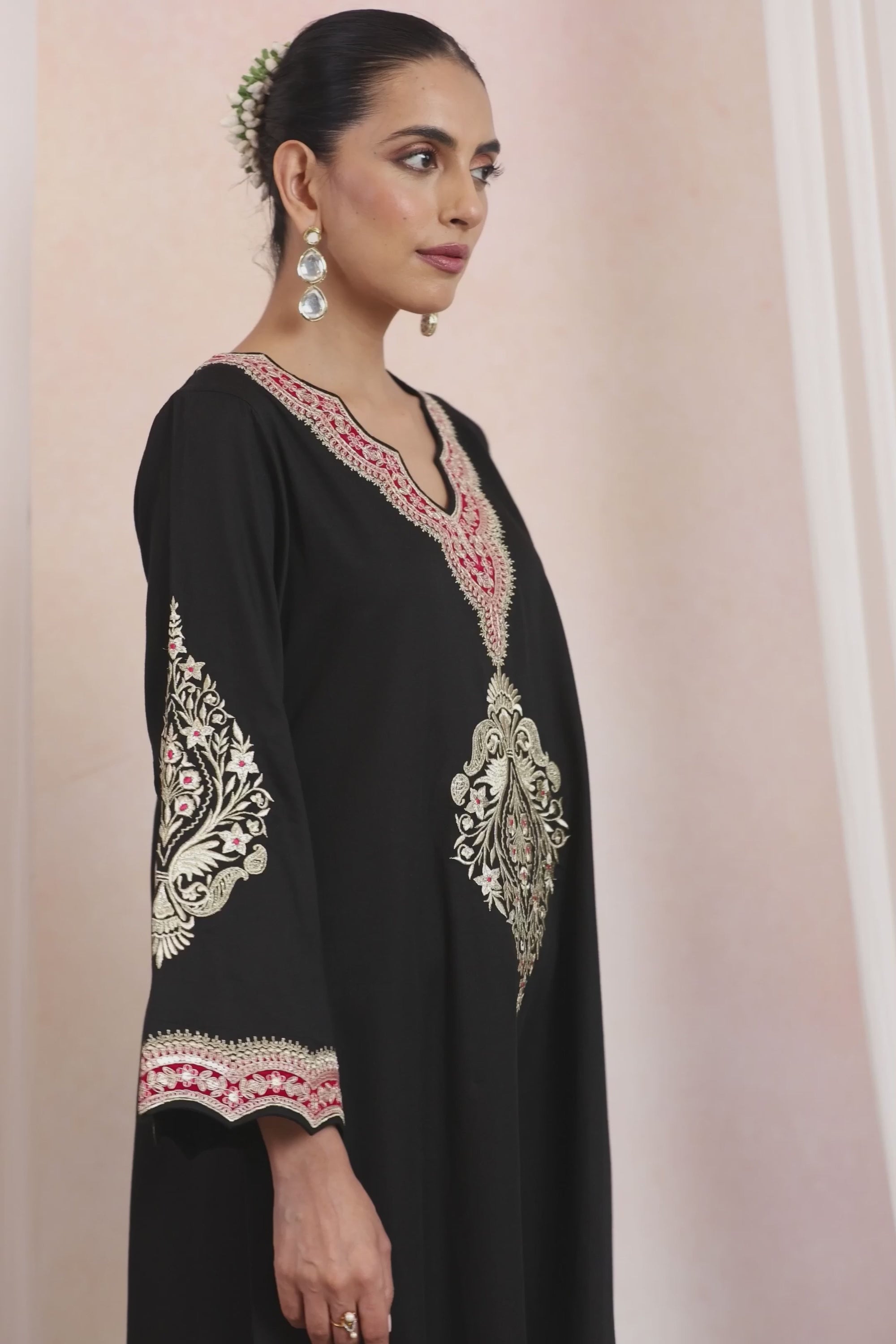 The Aaghaaz Black Embroidered Kaftan is a striking blend of elegance and comfort, crafted in soft, breathable cotton. Designed with a flowing silhouette, it carries intricate embroidery in subtle hues that lend a regal charm to its timeless black base. The neckline and sleeves are delicately finished with scalloping lace, adding depth and finesse to the design. With its graceful fall and side slit, the kaftan combines tradition with a touch of modern ease, making it perfect for festive evenings, cultural gatherings, or intimate celebrations. Pair it with statement jewelry and heels for an effortlessly sophisticated look.
