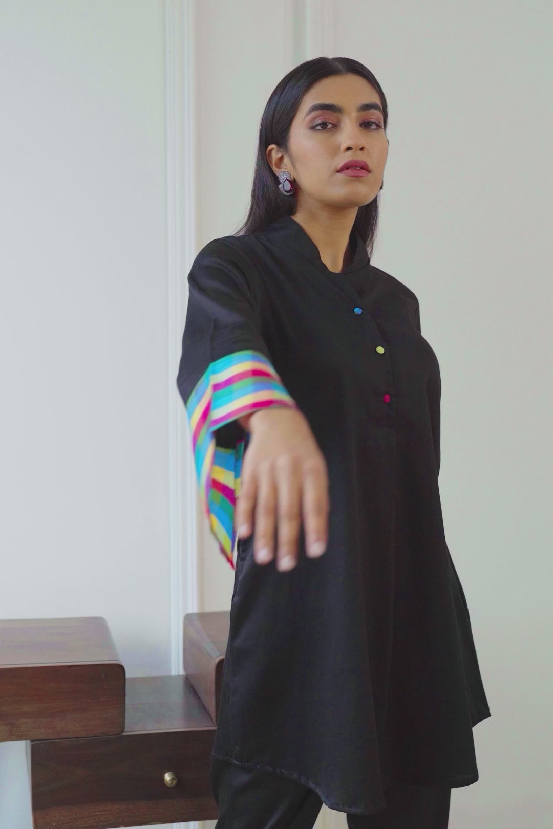 Elevate your style with the Evara Black Co-ord Set. Made from soft cotton, it features a vibrant multicolored block pattern on the sleeve ends for a playful touch. Perfect for any occasion, you'll love this co-ord set's comfort and unique flair.