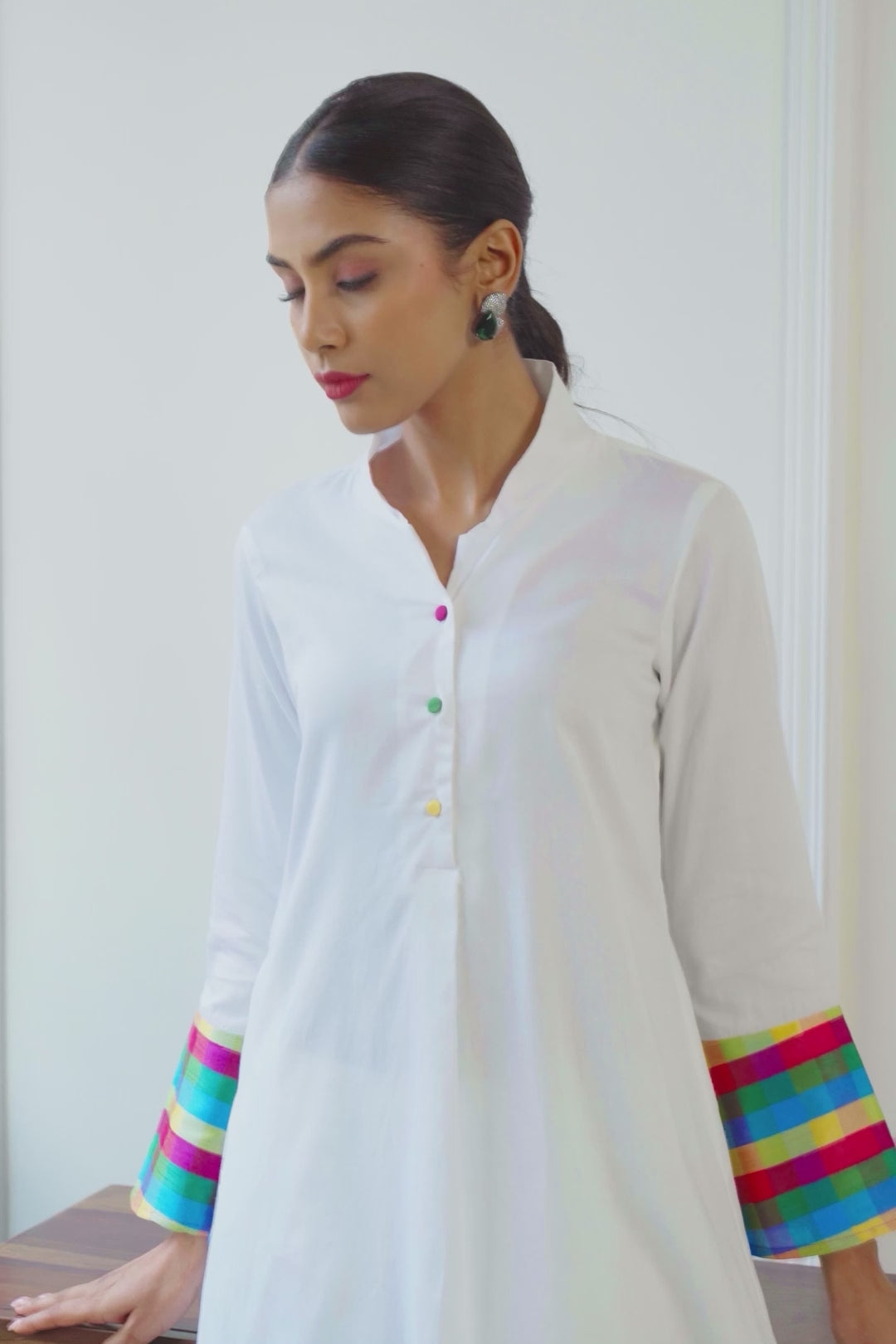 Elevate your style with the Evara White Co-ord Set. Made from soft cotton, it features a vibrant multicolored block pattern on the sleeve ends for a playful touch. Perfect for any occasion, you'll love this co-ord set's comfort and unique flair.