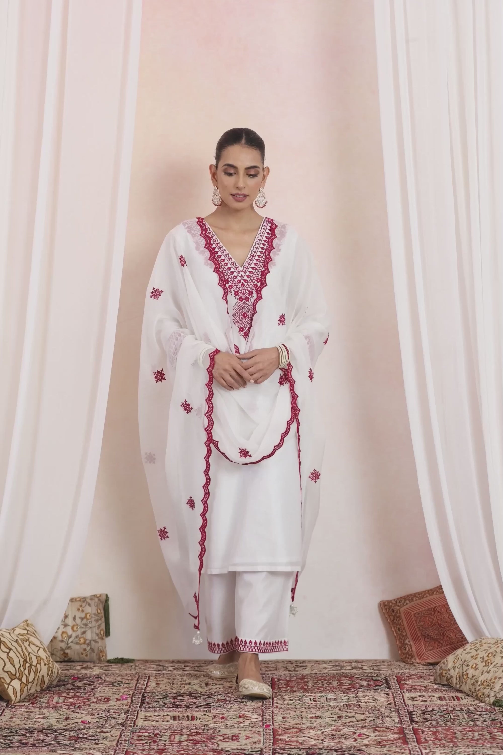 The Sheetal White Embroidered Kurta Set with Dupatta is a timeless blend of purity and elegance. Crafted in luxurious pure chanderi, the kurta features intricate red embroidery along the neckline, sleeves, and hem, adding a striking contrast to the pristine white base. Paired with straight palazzo pants detailed with delicate embroidery, the look is completed by a sheer organza dupatta adorned with scalloped borders and embroidered motifs. Light yet regal, this ensemble is perfect for festive gatherings, traditional celebrations, or elegant evening soirees. Graceful, versatile, and effortlessly sophisticated, Sheetal embodies classic charm with a contemporary touch for the modern woman.