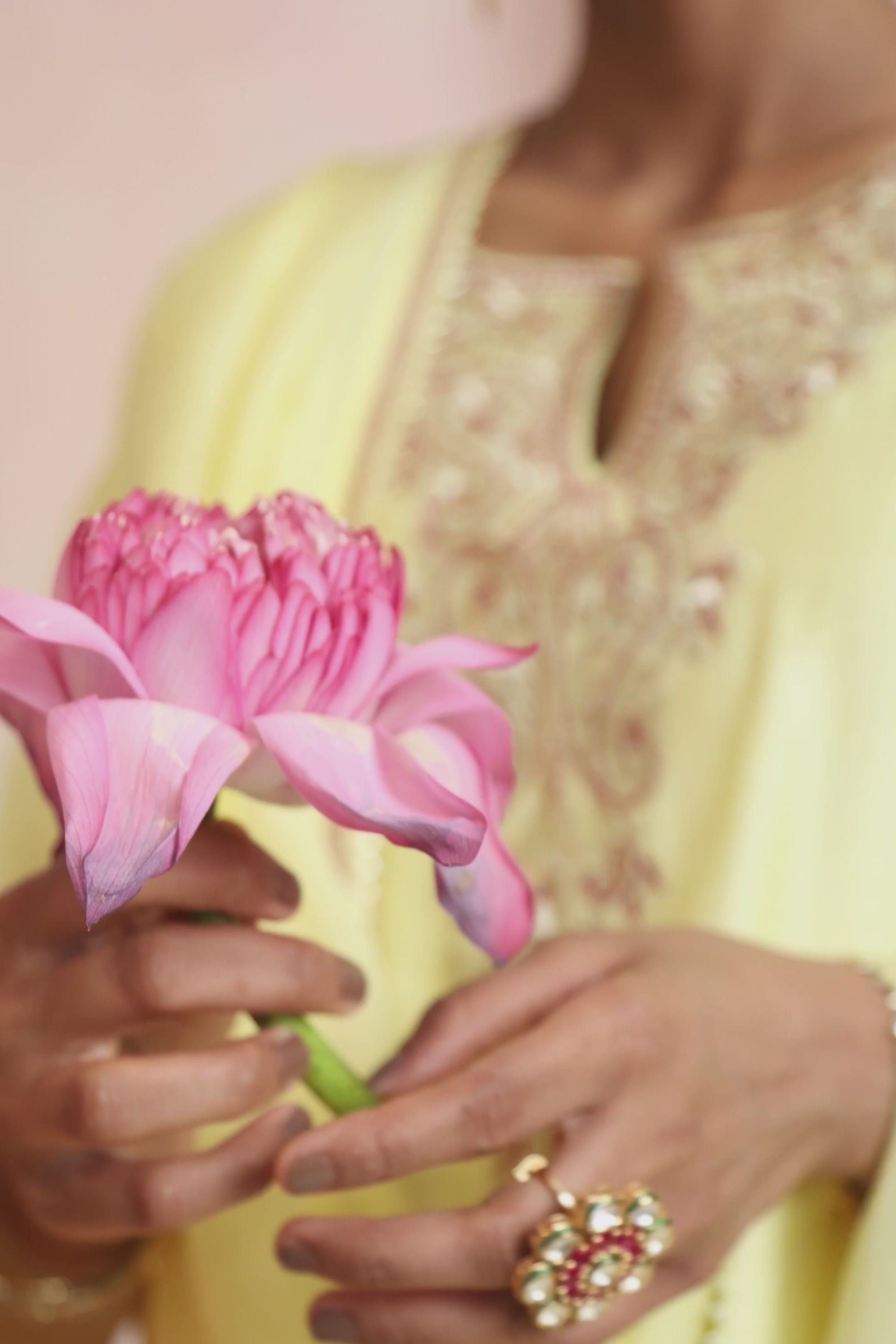 The Sunehri Yellow Embroidered Kurta Set with Dupatta is a radiant ensemble that beautifully balances tradition and elegance. Crafted from pure chanderi fabric, the soft yellow kurta is adorned with intricate embroidery around the neckline in delicate golden and subtle threadwork, adding a regal charm. The straight silhouette offers comfort while exuding sophistication, paired with finely detailed pants that enhance the look. A sheer organza dupatta with embroidered borders completes the outfit, lending it an ethereal touch. Perfect for festive occasions, haldi ceremonies, or summer celebrations, this set embodies freshness, grace, and timeless beauty, making it a standout choice for every wardrobe.