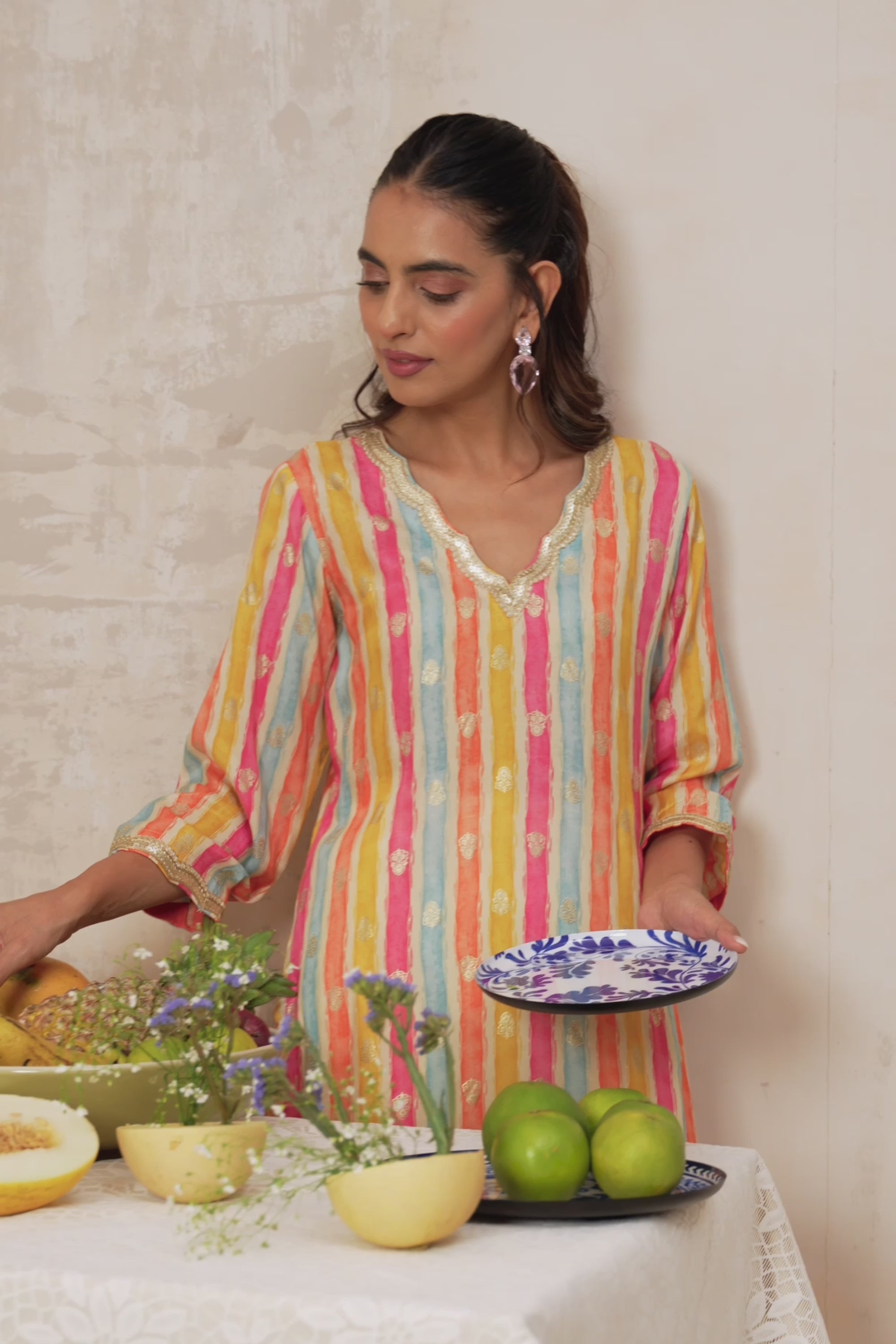 Experience the vibrant colors and softness of our Adele Multicolored Kurta Set. Made with muslin fabric, this set offers both style and comfort.