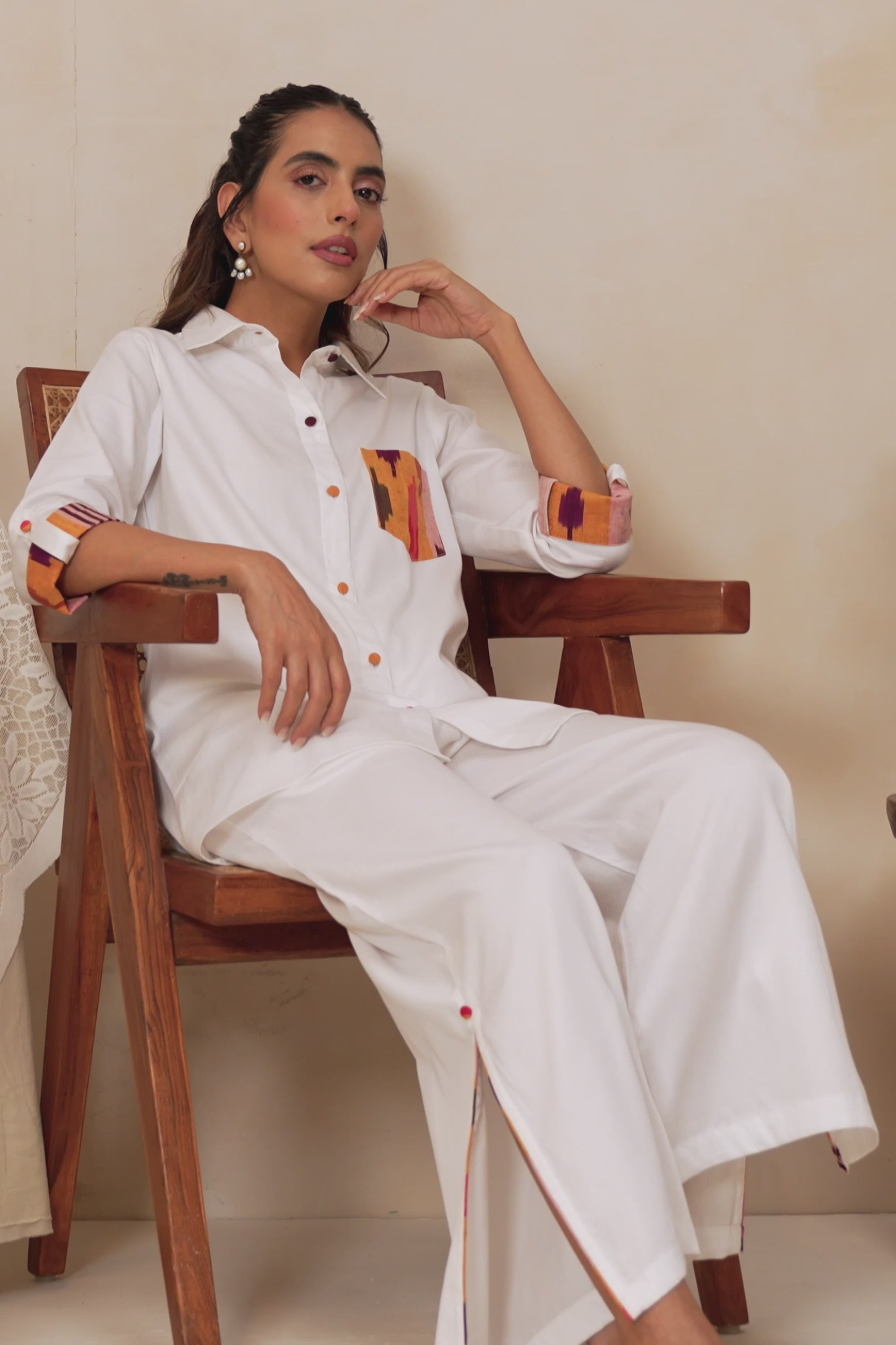 The Coral White Cotton Co-Ord Set is a chic and contemporary ensemble crafted from breathable cotton, ideal for warm-weather wear. The top is a straight-cut, longline shirt featuring a collared neckline and three-quarter sleeves, adorned with highlighted buttons down the front for a touch of rustic elegance. Its standout features include a vibrant ikat-print patch pocket on the chest and matching ikat fabric on the inner sleeve cuffs, which are stylishly turned up to reveal the colorful detail. The coordinating white pants are wide-legged and relaxed fit with side slit.