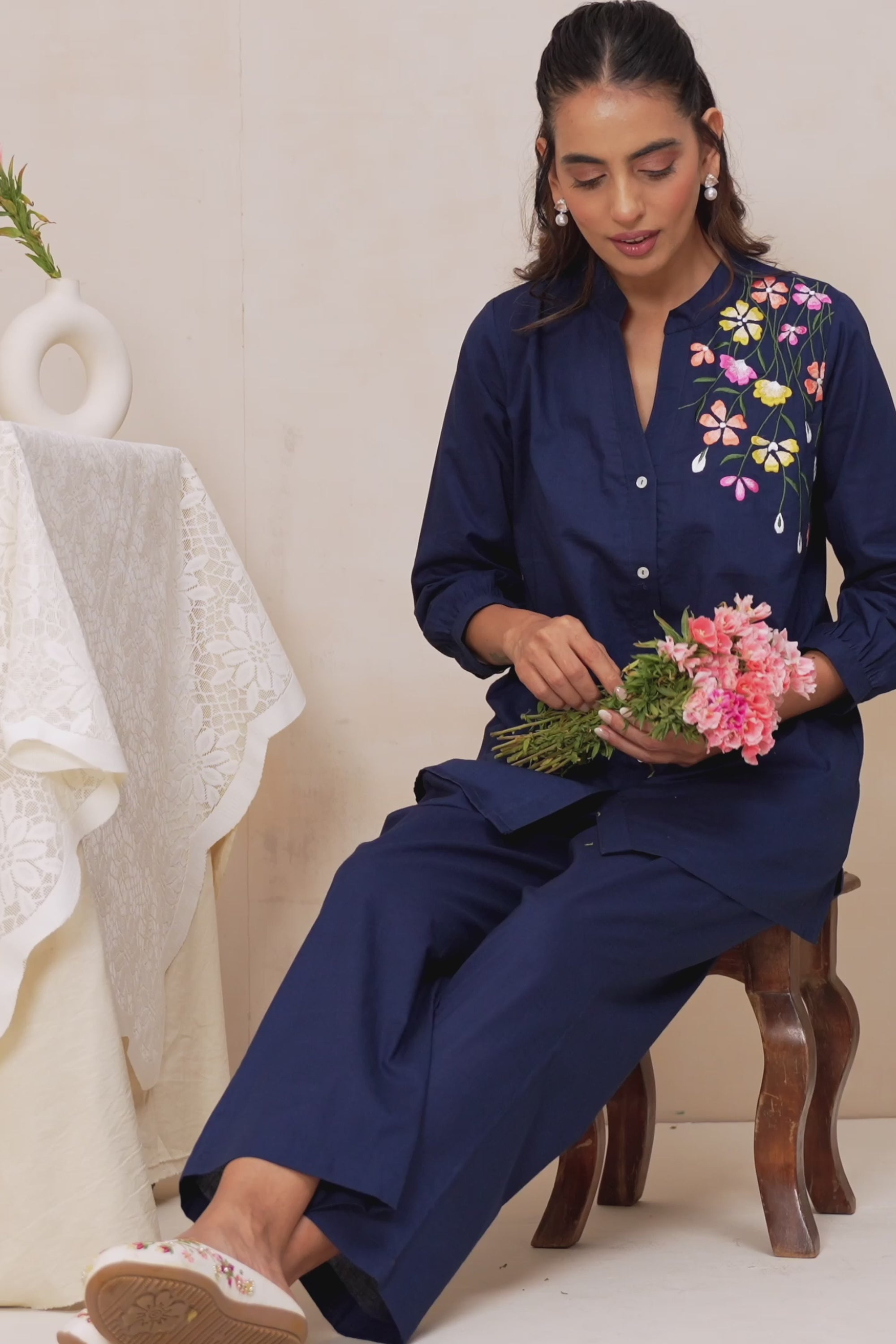 Elevate your style with our Melissa Indigo Embroidered Co-ord Set! This stunning set features intricate embroidery on a rich indigo fabric. Made from mulmul, it's not only stylish but also comfortable.