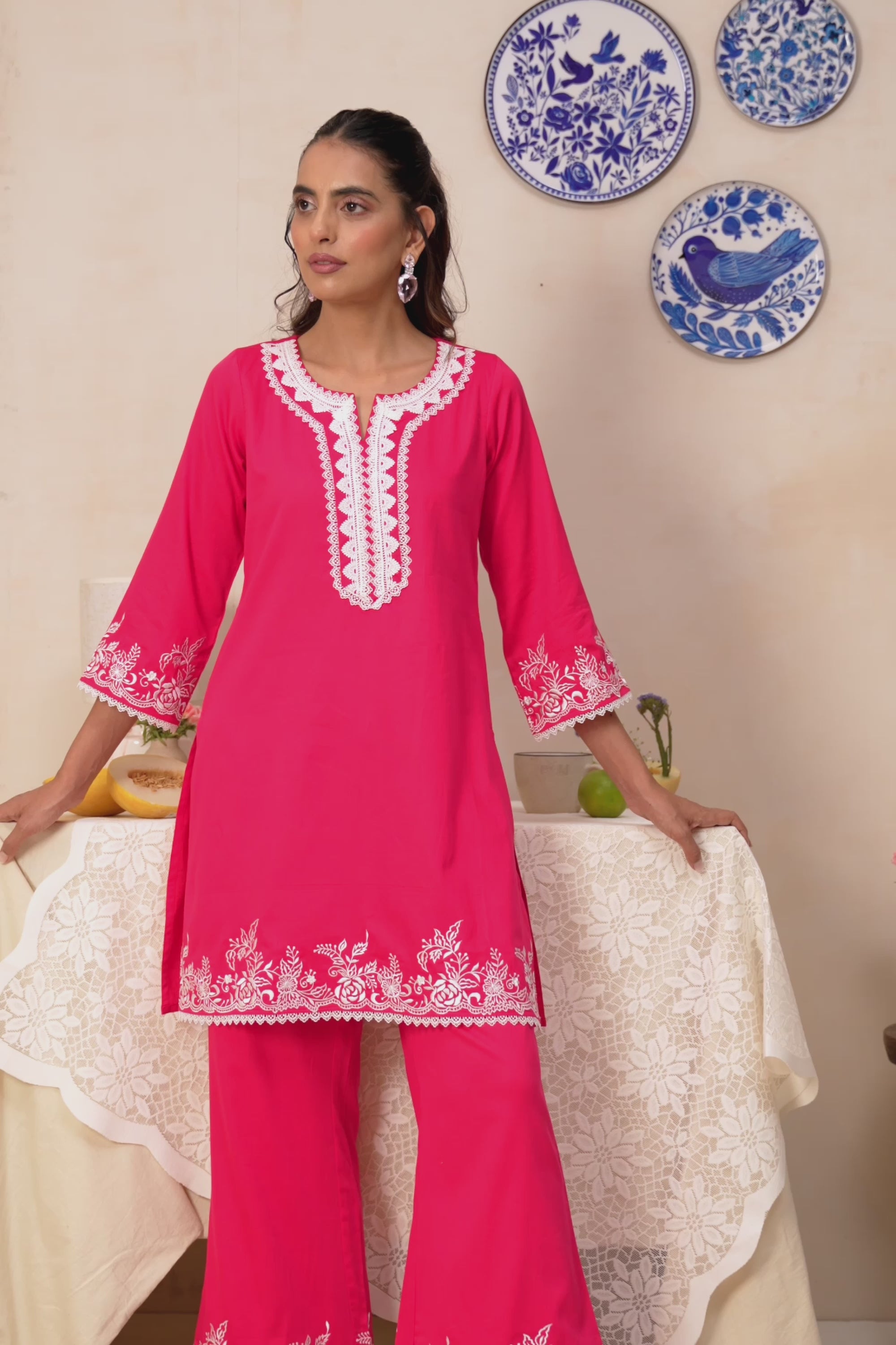 Reine Red Embroidered with Delicate Lace Kurta Set. It features a bright red cotton kurta adorned with intricate white floral embroidery along the sleeves, hemline, and neckline, accented with delicate lace detailing. The kurta has a straight, relaxed fit with a round neckline and three-quarter sleeves. It is paired with matching straight-cut red pants, which also have coordinated embroidery near the hem. The look is completed with traditional floral-embroidered slip-on footwear, giving it a very elegant and fresh ethnic charm.