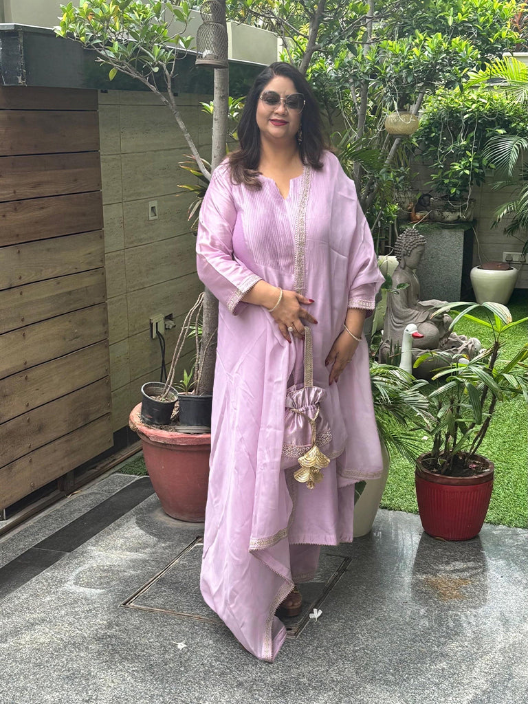 This Rukhsar White Kurta Set with Dupatta features a chanderi kurta, a mulmul magenta palazzo, and a georgette dupatta for a complete and stylish look.