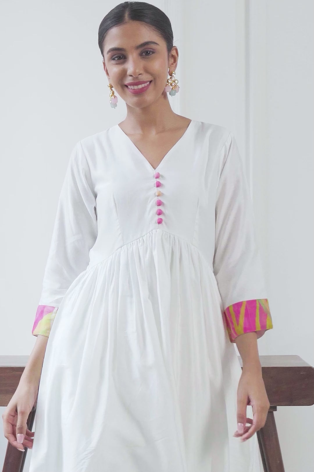 The Emily Multicolored Chanderi Anarkali Set is a stunning blend of elegance and tradition. The Anarkali kurta is crafted from lightweight Chanderi fabric in a pristine white shade, featuring a flowing silhouette that enhances grace and movement. It has a V-neckline with delicate pink buttons running down the front, while the three-quarter sleeves and hemline are accented with vibrant multicolored borders, adding a playful yet sophisticated touch. Paired with classic white straight palazzo pants, this ensemble is perfect for festive occasions, cultural events, or elegant casual wear, offering a timeless and breezy charm.
