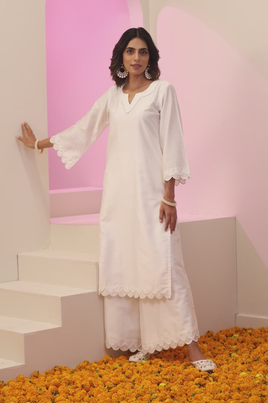 The Fiza White Embroidered Kurta Set is crafted from chanderi and is accompanied by a coordinating palazzo with pockets. Enhance your wardrobe with this statement piece that exudes elegance and sophistication.