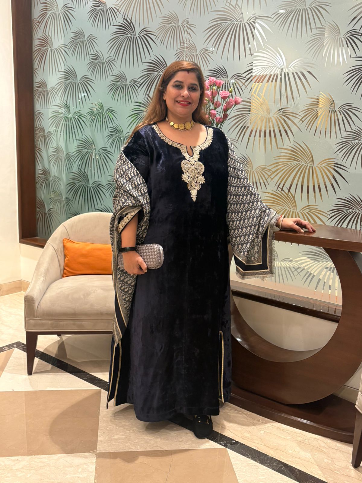 The Aaghaaz Black Embroidered Kaftan is a striking blend of elegance and comfort, crafted in soft, breathable cotton. Designed with a flowing silhouette, it carries intricate embroidery in subtle hues that lend a regal charm to its timeless black base. The neckline and sleeves are delicately finished with scalloping lace, adding depth and finesse to the design. With its graceful fall and side slit, the kaftan combines tradition with a touch of modern ease, making it perfect for festive evenings, cultural gatherings, or intimate celebrations. Pair it with statement jewelry and heels for an effortlessly sophisticated look.
